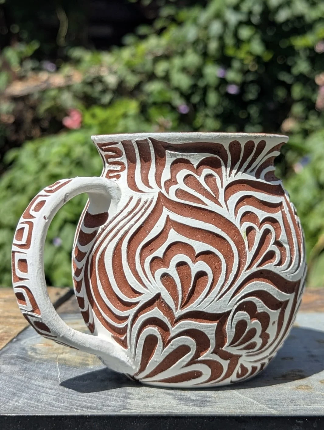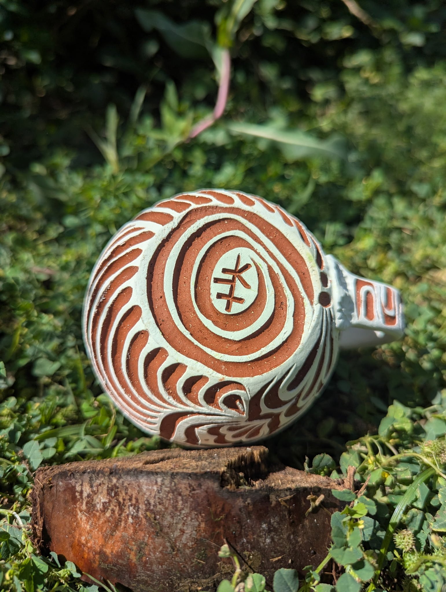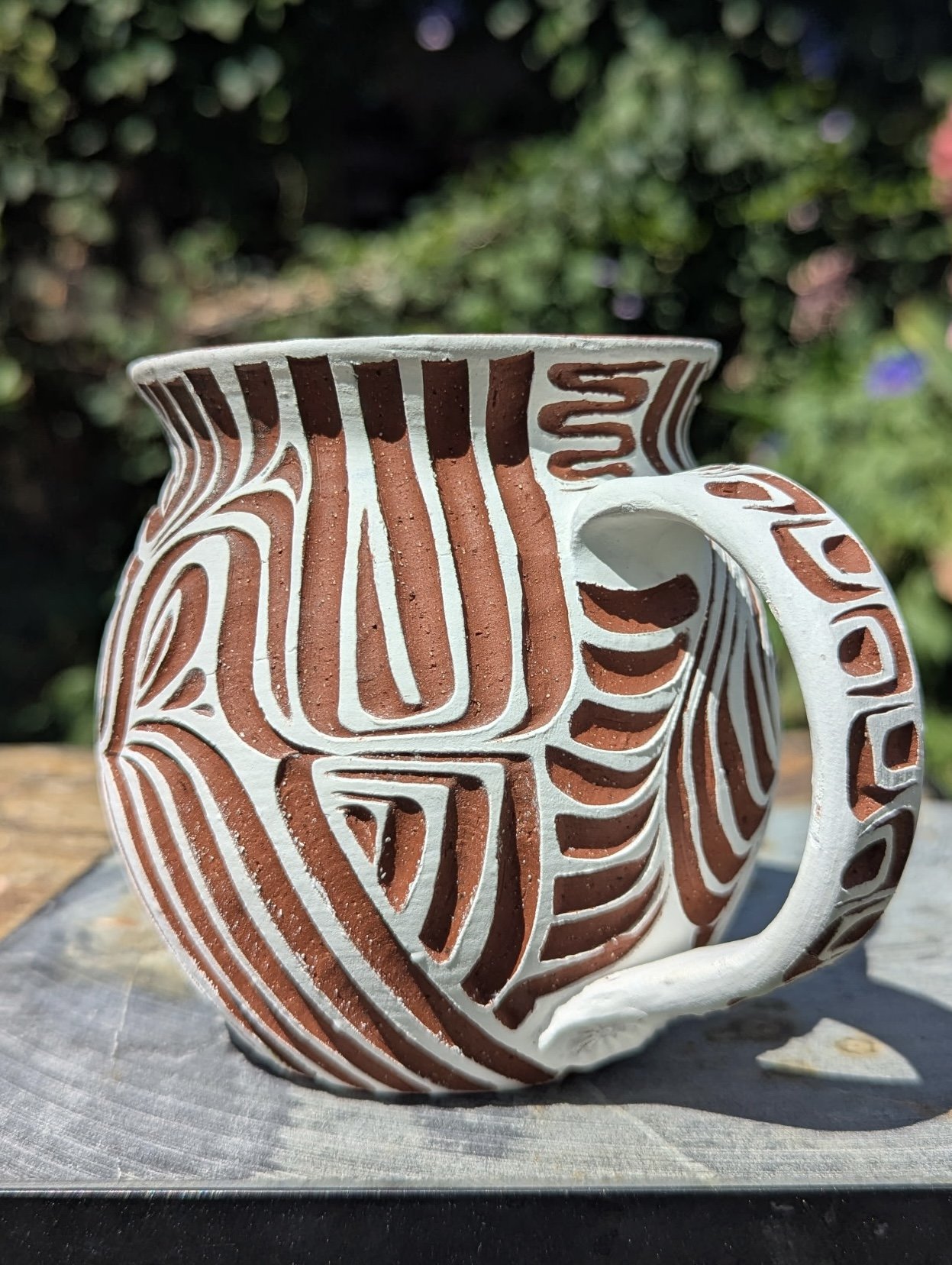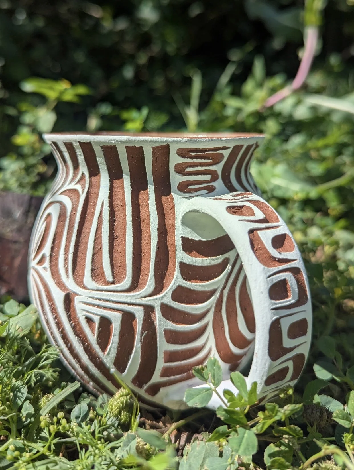 A mug that feels both earthy and refined—contrasting tones, tactile texture, and unmistakably human craftsmanship. Subtle variations in line weight, spacing, and composition give each piece its own personality. Designed to be held, used, and appreciated daily, it’s as much a functional object as it is a small, one-of-a-kind work of art by Asa Maestas.