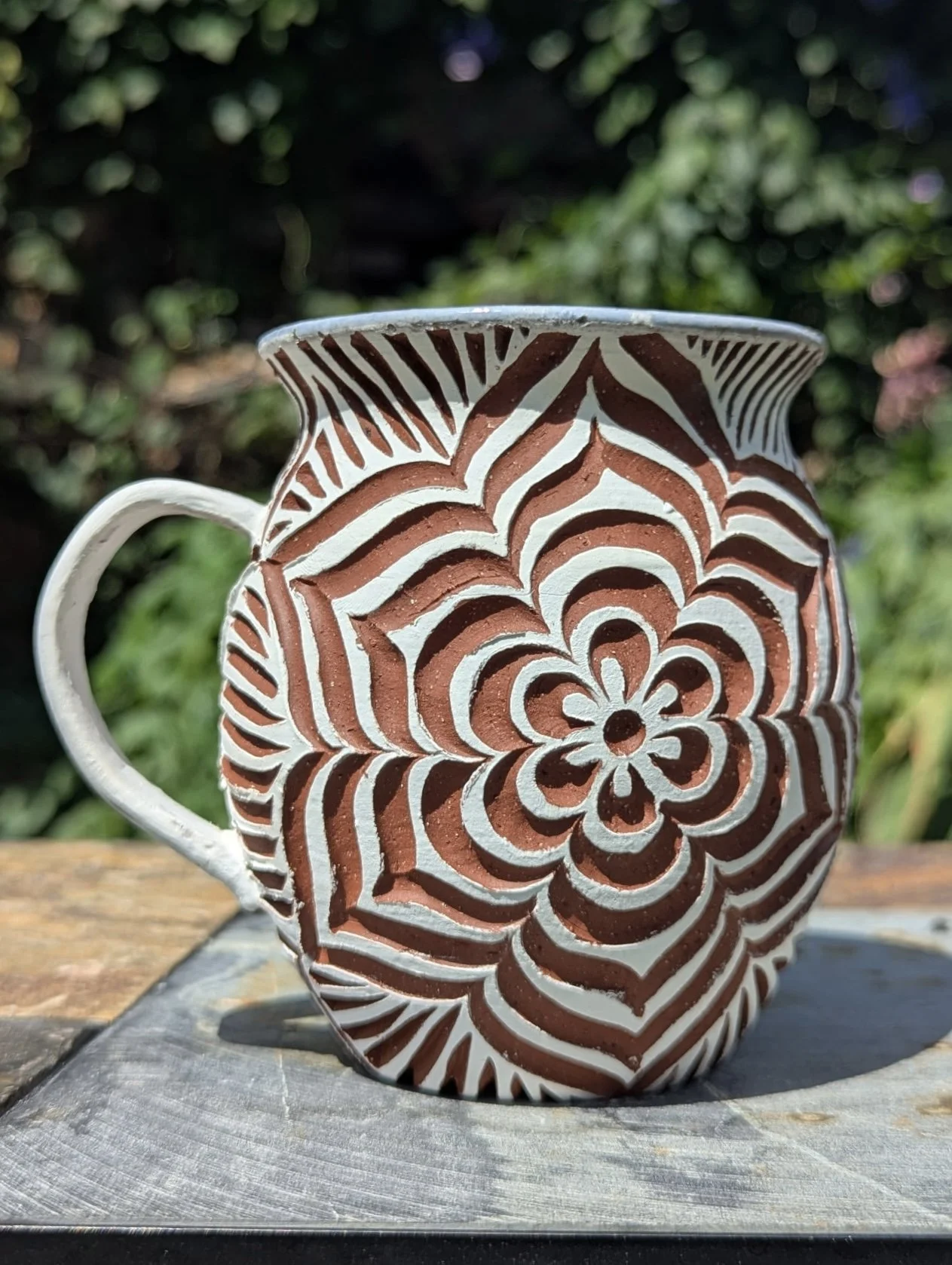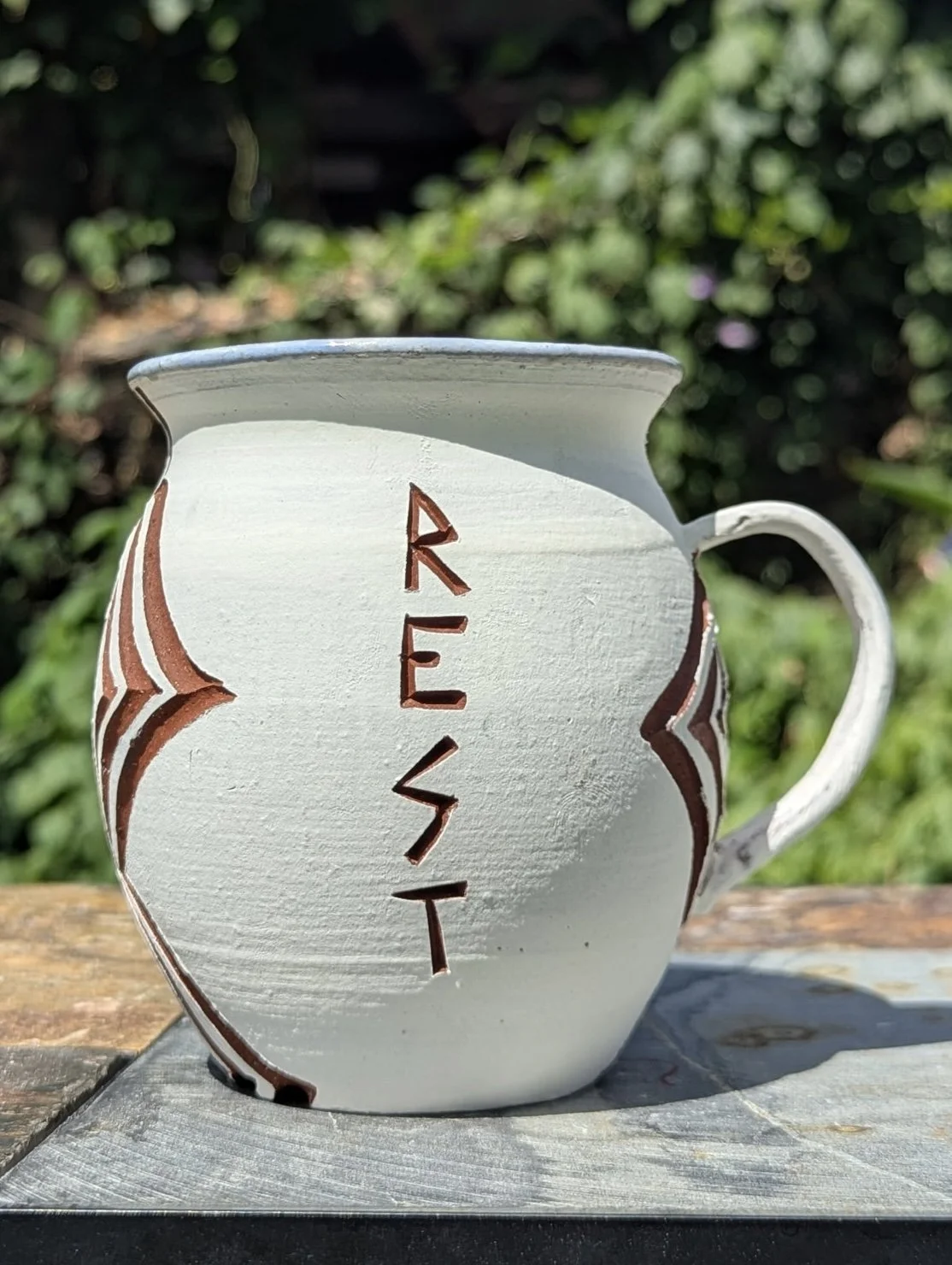 A mug that feels both earthy and refined—contrasting tones, tactile texture, and unmistakably human craftsmanship. Subtle variations in line weight, spacing, and composition give each piece its own personality. Designed to be held, used, and appreciated daily, it’s as much a functional object as it is a small, one-of-a-kind work of art by Asa Maestas.