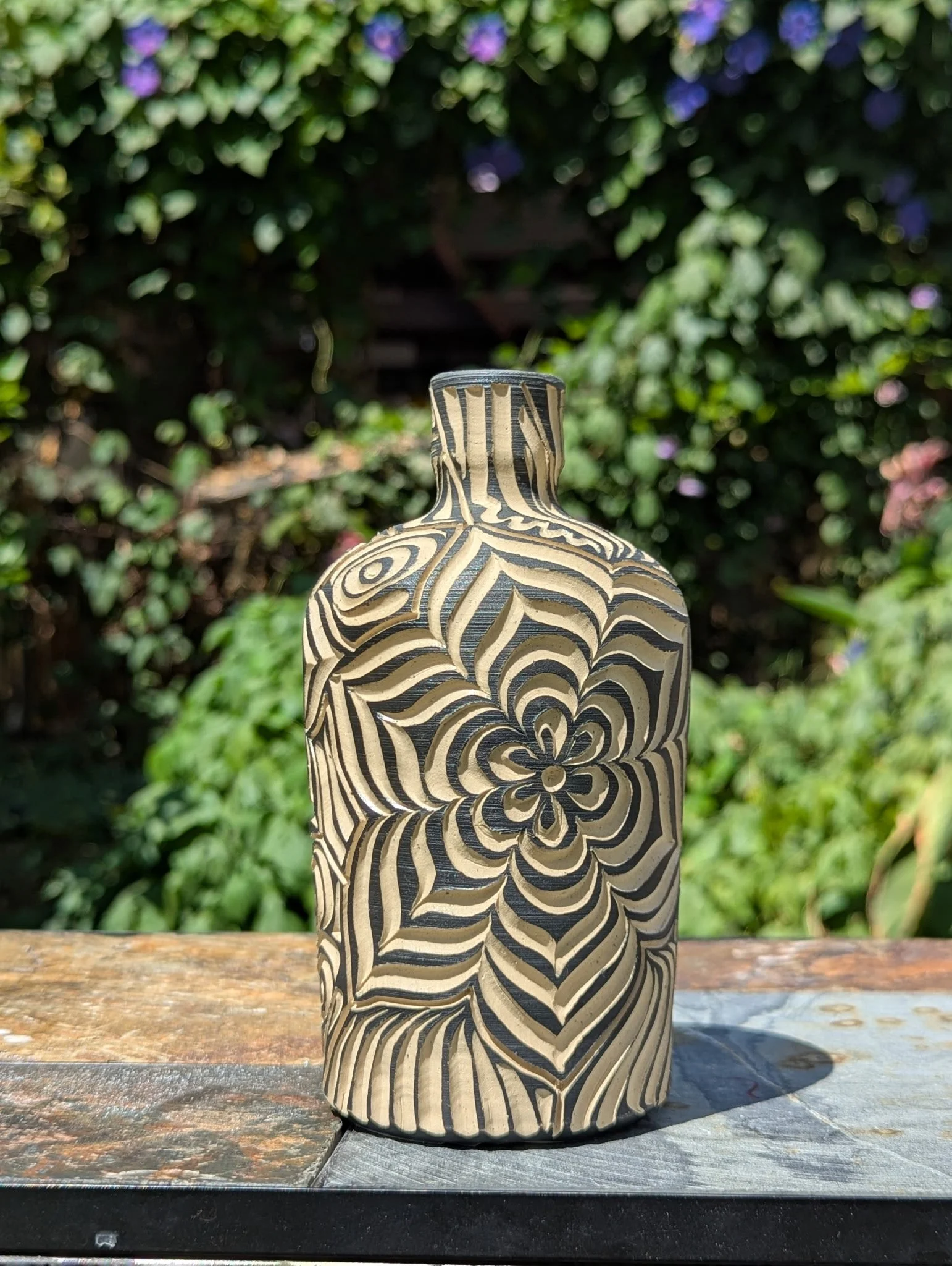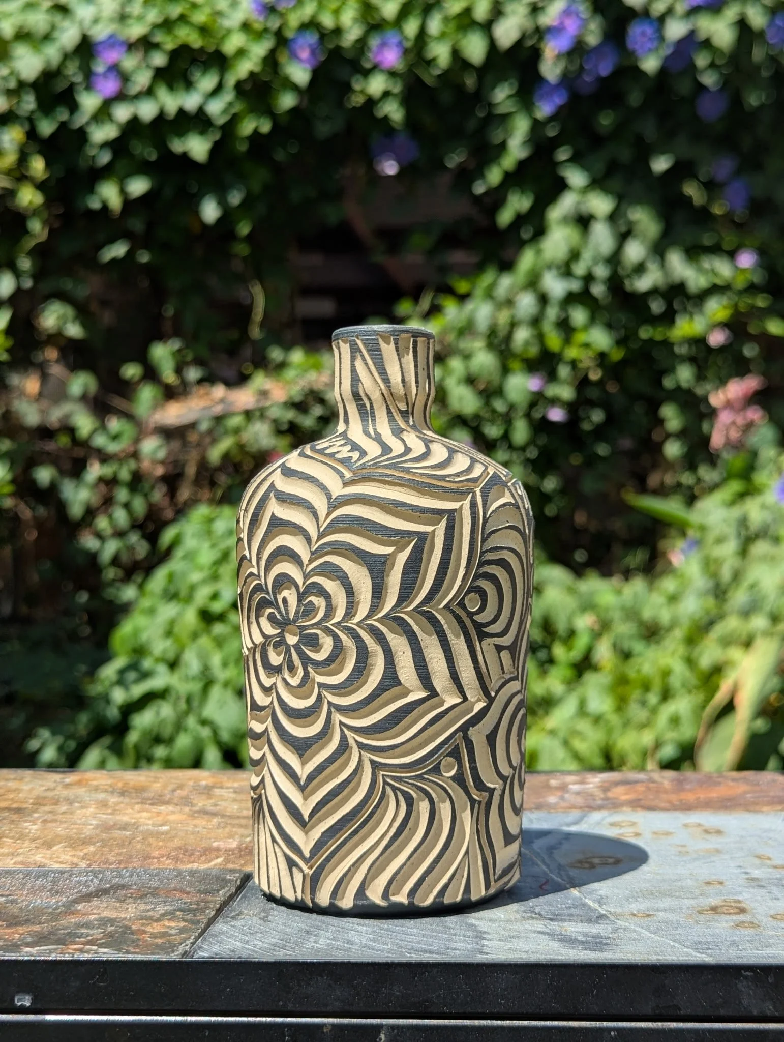 Elevate your kitchen or table with this one-of-a-kind, hand-carved oil bottle. Crafted from white clay and finished with a striking black underglaze, each piece features intricate sgraffito detailing—carefully etched by hand to reveal layered patterns and textures that make every bottle truly unique.
