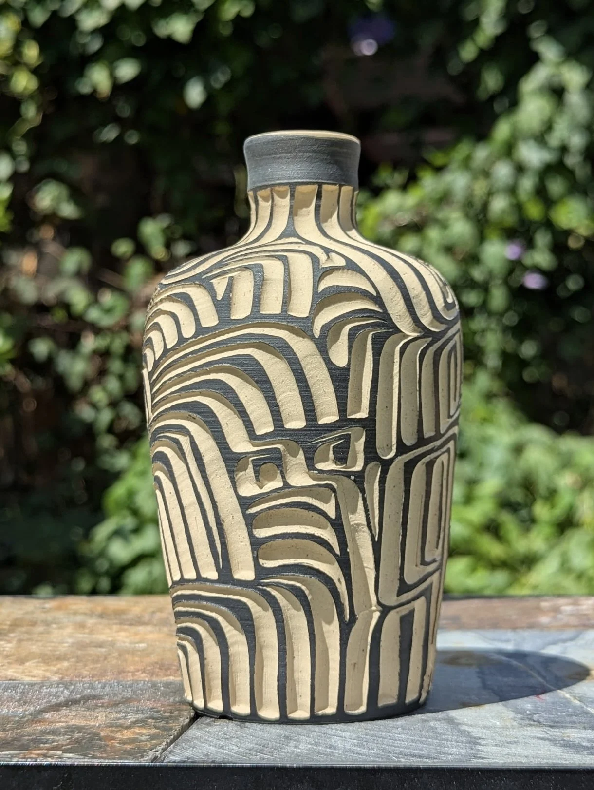 Elevate your kitchen or table with this one-of-a-kind, hand-carved oil bottle. Crafted from white clay and finished with a striking black underglaze, each piece features intricate sgraffito detailing—carefully etched by hand to reveal layered patterns and textures that make every bottle truly unique.